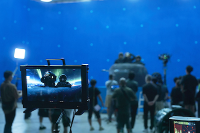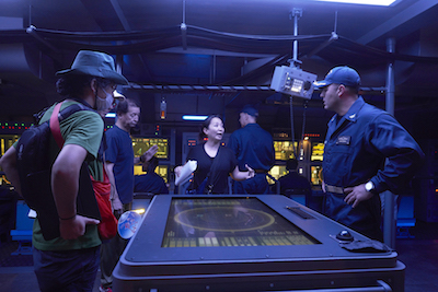 ■ 写真9は,今回提供された唯一のVFXメイキングシーンである。北極点の海面上に浮上した「やまと」の上方にオーロラが見える幻想的で美しいシーンだが,このオーロラもCG製と思われる。このシーン以外にも,「やまと」が浮上するシーンはすべてブルーバックでのスタジオ内撮影である。潜水艦の艦内は,前作と同様,精巧に作られた屋内セットだが,「オーロラ作戦で登場する米国原潜シーウルフのアレキサンダー号の艦内も,「やまと」とほぼ同じに見えた(写真10)。「やまと」ことシーバットも米国製であるから似ていて不思議はないが,おそらく操作端末の画面だけを入れ替えて,屋内セット自体は使い回したのだろう。写真6と写真10を見比べれば分かるが,中央のCIC卓(Combat Information Center Console)の上部のデザインが少し違っている。ただし,ご愛嬌程度の差に過ぎない。