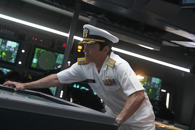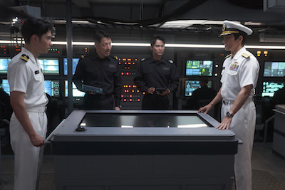 吉野耕平監督初め,主要キャスト&スタッフは基本的に継続登板である。「やまと」は前作以降,寄港せずにずっと航行中であるので増減のありようがなく,海江田四郎艦長(大沢たかお),山中栄治副長(中村蒼)以下,水測長・溝口択男(前原滉),IC員・入江覚士(松岡広大)らがそのまま出演している(写真6)。本作では,潜水艦たつなみの深町洋艦長(玉木宏)と速水貴子副長(水川あさみ)の出番はない。主役の大沢たかおが,前作より痩せていて,少し威厳不足の感じた。実のところ,彼は『キングダム』シリーズに将軍・王齮役で出演時には20kg増量し,その後,減量するという。前作と本作の間に『キングダム 大将軍の帰還』(24)があったので,減量時に少し減らし過ぎたのだろうか。あるいは,『キングダム 運命の炎』(23)での増量後,あまり減量できないまま,こちらの第1作の撮影に入ったということかも知れない。まあ,この映画としては,ずっと艦内で過ごし,海戦続きの緊張感で食事もロクに取れず,少し痩せたという解釈で構わないのだが(笑)。