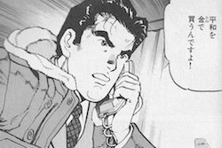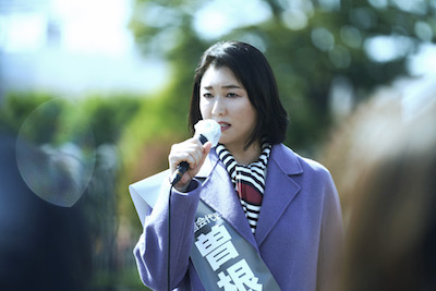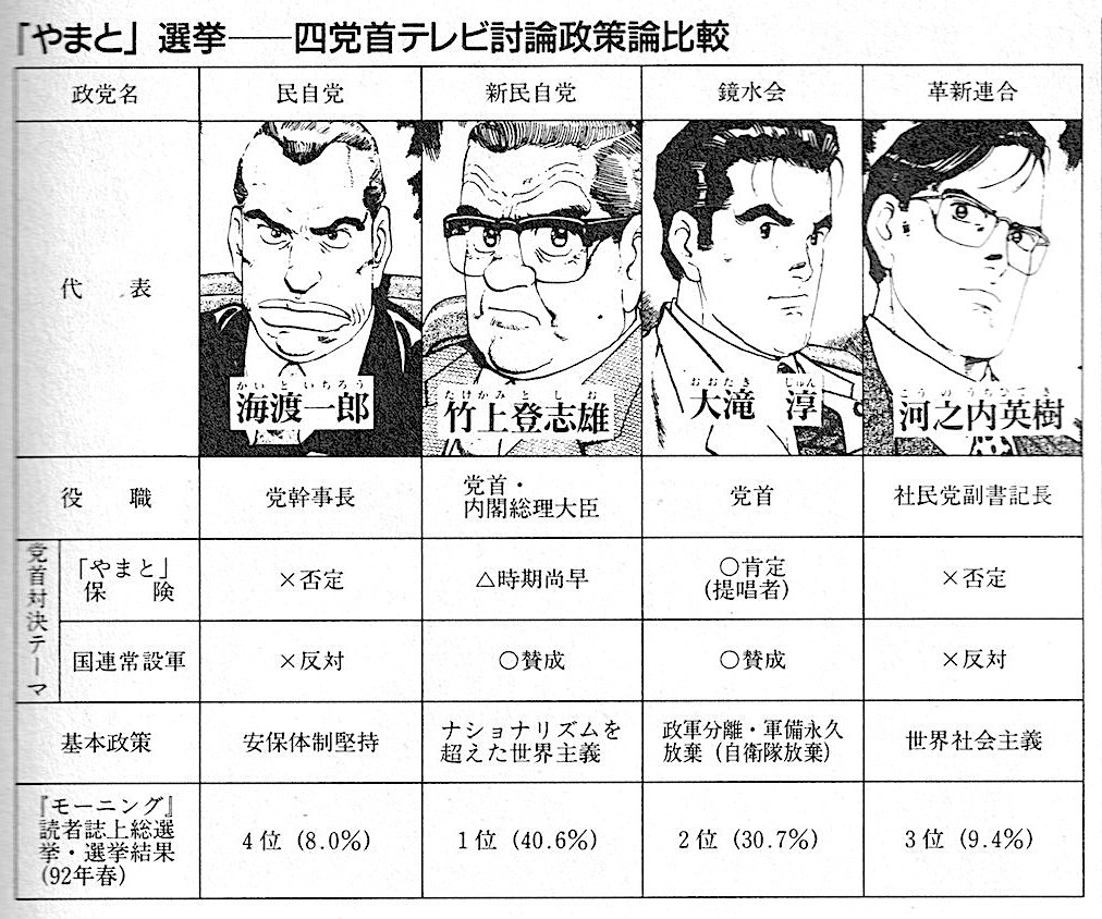 ■ 海江田の「やまと独立国宣言」を巡って,竹上総理が衆議院を解散し,総選挙が行われるのは原作も本作も同じである。原作では,1992〜93年の連載当時,4党首のTV討論での政策発言を掲載し,週刊「モーニング」の読者に誰に投票するかを公募するという奇抜な企画を実施した。言わば,架空の誌上総選挙である(表1)。これを受けて実写映画の本作でも4党首の政策討論を描いていたが,その顔ぶれが異なっている。原作では,与党「民自党」が3分裂し,総裁であった竹上総理(笹野高史)と海原官房長官(江口洋介)らは離党して「新民自党」を興し(写真2),大滝淳議員(津田健次郎)は新党「鏡水会」の党首となっている。即ち,与党・民自党は原作では3分裂した。この他に「革新連合」の河之内英樹なる人物が登場するが,映画では防衛大臣の曽根崎仁美(夏川結衣)に置き換わっていた。竹上総理のやまと支持に同意できない彼女も離党して,「悟信会」代表として総選挙に臨んでいる(写真3)。即ち,映画では民自党が4分裂して,彼らだけの党首討論に終始していて,革新の野党は全く出番がない。もはや,日本の政治力学の中で野党は何の力もないと宣言しているかのような大胆な脚本である。ただし,この脚色にはあまり賛成できなかった。野党連合の中から,河原崎に相当する新登場の俳優を1人,キャスティングすれば済んだことではないかと感じた。