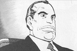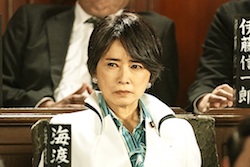■ 加えて,映画での脚色で驚いたのは,原作では4党首はすべて男性だったが,映画では男女それぞれ2人ずつになっていたことだ。民自党幹事長の海渡一郎を,女性の海渡真知子(風吹ジュン)に置き換えていたのである。大滝淳役は津田健次郎で違和感はなかったが(写真4),最も強面の海渡一郎を,全くイメージの異なる女性にしたのは驚きであり,斬新な脚色であると感じた(写真5)