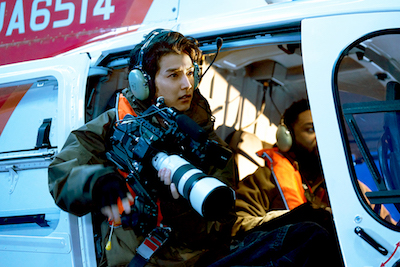 報道ニュースキャスターの市谷裕美(上戸彩)は実写映画でのオリジナルキャラクターであるが,海江田艦長への取材での責任を問われ,本作では退社してフリージャーナリストとなっている。彼女はNYまで「やまと」を追い,ヘリをチャーターして上空からNY沖の海戦の推移を中継する。ここで,彼女に帯同し,ヘリに同乗しているのは,新登場のフリーカメラマンの森山健介(渡邊圭祐)(写真7)と上述のボブ・マッケイ(トーリアン・トーマス)である。原作では,マッケイは北極海で大滝のヘリに同乗していて,NY沖ではこのヘリに乗っていない。NY沖では,彼は自らのカメラクルーを連れて米軍の空母に同乗し,報道を続けていた。本作は,市谷裕美の役割を大きく見せる脚色だが,この程度の改編は十分許せる範囲だ。