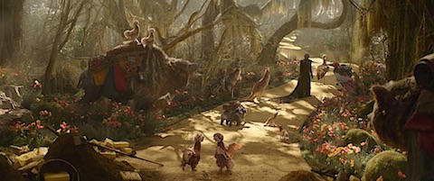 新たな登場人物はないと書いたが,思いがけない展開であった。前編のレビュー記事では,「(冒頭の)この数秒のシーン以外に本作にドロシーは登場しない。後編『Wicked: For Good』にサブライズ登場する可能性もないではないが,「舞台版」にその配役はなかったので,多分出て来ないだろう」と書いてしまったのだが,予想を裏切って,しっかり姿を見せる。ただし,徹底してドロシーの顔は描かれていない。その一方で,かかし,ブリキ男,臆病なライオンは,ドロシーと共に行動するようになった経緯が盛り込まれ,表情も克明に描かれていた。これは観てのお愉しみだ。その他,エルファバの妹のネッサローズとその召使いのボック,空飛ぶ猿たちを率いるチステリーの出番は増えていると言っておこう。