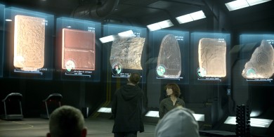 | ■ 赤い光を放って洞窟内を飛び回る球体は,通信機能をもったレンジファインダーだ(写真12)。技術的な背景のあるデザイナーを起用していることが伺える。近い将来,ラジコン操縦型なら作れるかと感じた。そうして観測した幾何形状データの表示には,立体ホログラムのオンパレードだ。圧巻は全周型の天球儀で,その美しさに息を呑む(写真13)。半球型デスクトップ・タイプ(写真14)も印象的で,いずれもFuel VFX社の産物である。その他の場面でも,透明表示が再三登場する(写真15)。最近どのSF映画でもこの種の(半)透明表示とタッチ操作が流行だが,実用的には,この種の空中透明表示は,実に使い難いのだが……。