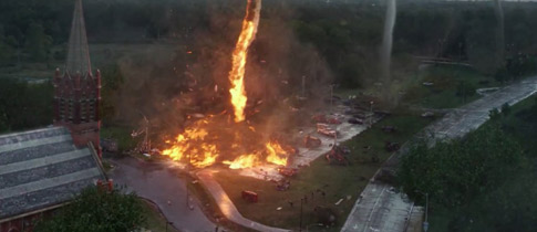 断続的に何度か竜巻シーンが登場する(写真8)。だんだん凄くなり,最後は史上最大級の竜巻が到来する。直径1km,時速600kmというから,なるほど,これはモンスターだ(写真9)。90分弱の短尺ながら,その間の緩急の付け方が見事だ。CG的には,竜巻自体の表現だけでなく,大粒の雹や漏斗雲の表現も絶妙であるし,家やビルが破壊される過程,破壊された街の残骸も絶品である。筆者が最も感心したのは,炎が竜巻の渦に引火し,空まで火焔が巻き上がるシーンだ(写真10)。これをCGで描かせる監督のセンスの良さが気に入った。