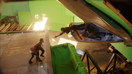 写真4 ダイビングする3人だけが本物で,割れたガラスも外のビルもすべてデジタル合成。