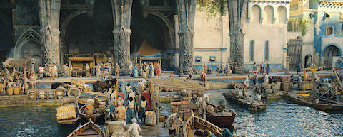 ■ 映画版『LOTR』に比べて,港や海のシーンが多用されている。ヌーメノールは島国であるので,必然的に海のシーンが多くなるが,町の光景はベニスを思い出してしまう(写真9)。中つ国とヌーメノールやヴァリノール間の移動にも船が使われているので,船上のシーンや海上を船が航行するシーンも再三登場する。海のシーンが美しい。高額製作費なので,多数の船を実際に作ったのだろうが,CG制の船を合成したと思しきシーンも多数ある(写真10)。