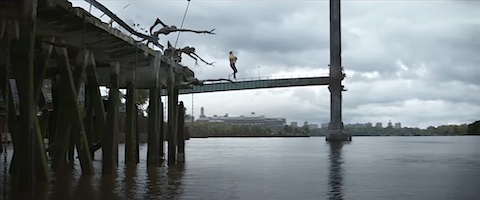 ■ 群衆もかつてならエキストラを使用しただろうが,今では,極く少人数で済ますか,丸ごとCGの人物像を実写映像に描き加えるのが普通だ(写真13)。一方,水没した地下鉄坑道内をサムとエリックが移動するシーンは,本物の坑道を利用はずはなく,ミニプールで撮影し,坑道がずっと続いているように加工して見せているだけだろう(写真14)。水もCGで描けるが,さすがに全く本物の水なしで撮影しているようには見えなかった。