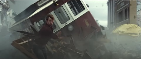 ■ 家やクルマが竜巻で舞い上がるシーン(写真14)は,もはや当たり前だ。既に96年版から登場していたのに,それを超える表現が見られない。この点でも,大型トレーラーがジャンボジェットが宙を舞う姿を見せた14年版の方に軍配が上がる。少し楽しく観られたのは,市中の路面電車が風で動き出し,倒れるシーンだ。本物の車両を移動させ,倒しているが,主人公達の後から迫って来るシーンは,勿論VFX合成である(写真15)。